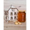 Dárkové balení na sklenici medu v podobě tradičního domečku s odnímatelnou střechou.